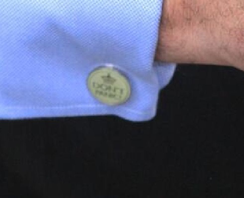 Ladies and gentlemen, that there crown above the words is a dead giveaway. These cufflinks are clearly patterned on a parodyof the old "Keep Calm and Carry On" posters from WWII. We submit to you that these are the cufflinks of a politician who is wearing a good-luck gift, not the cufflinks of a proper fan.