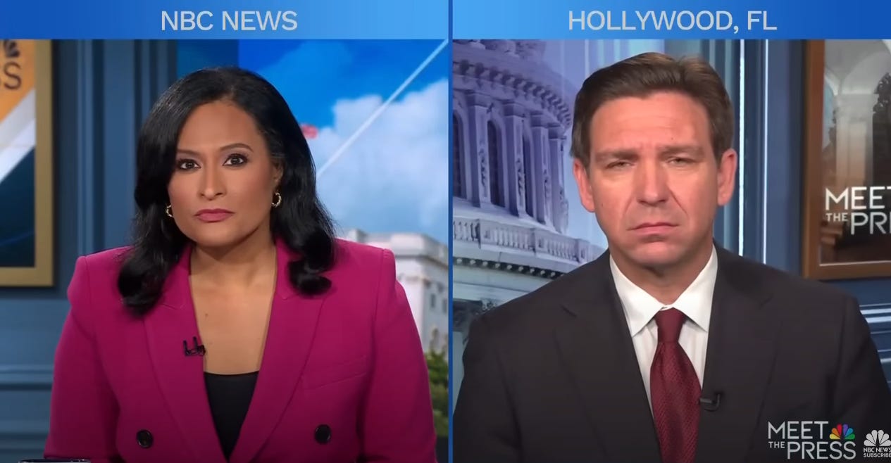 DeSantis, attempting to lurch back up one more time like a horror movie monster, made an appearance on NBC’s “Meet The Press” on Sunday. He was not, however, counting on new host Kristen Welker putting him down like slayer instead of “both sidesing” him like a common Chuck Todd.