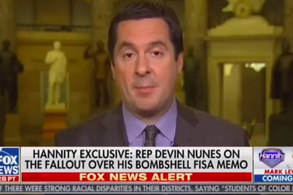 The first is that the FBI has cavedand handed Nunes and Rep. Trey Gowdy all kinds of documents on the Russia investigation, because Nunes and Gowdy need them for "oversight" purposes. (For Nunes, "oversight" should always be read as "leaking to Fox News in order to run interference for Donald Trump.") We haven't covered every single twist and turn of this fight, because it's mostly been Nunes saying "GIVE ME OUR NATION'S DEEPEST DARKEST SECRETS" and the DOJ saying "fuck off" and Nunes saying "INPEACH! INPEACH! INPEACH!" Rinse, repeat, and so forth.
