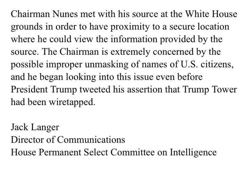 Well, we now have a statement from Jack Langer, spokesgoon for Nunes, and it says yeah, he went to the White House grounds, because he had to get to a Sensitive Compartmented Information Facility (SCIF) so he could look at the super secret sexxxy intelligence info, with his "source":