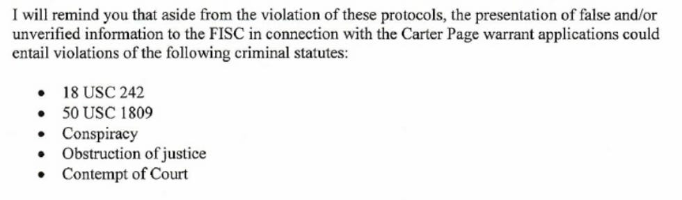 UH HUH. Well, conspiracy, obstruction of justice, and contempt of court are not "statutes" per se. And only a judge can find someone in contempt of court. And 50 U.S. Code § 1809 does refer to unlawful electronic surveillance, but specifically exempts searches "authorized by and conducted pursuant to a search warrant or court order." And no, STFU, Carter Page was being actively recruited by Russian spies over several years! The US government did not violate his Civil Rights under 18 U.S.C. § 242 by lawfully obtaining a FISA warrant on him and renewing it when they caught him doing all that weird Russia stuff.
