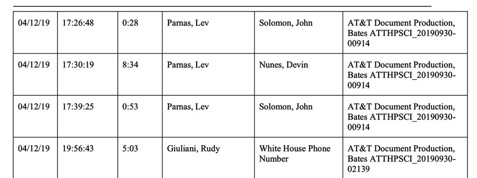 One thing reporters noticed quickly is that the report includes call logs the committee subpoenaed that show that OH BOY, committee ranking member Devin Nunes sure has spent a lot of minutes on the phone with the co-conspirators in Trump's Ukraine scheme, including Chucklefuck Lev Parnas, who is under criminal indictment, and Rudy Giuliani, whose federal indictment just might be coming any day now, MAYBE ALLEGEDLY.