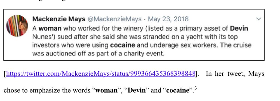 DEAR GOD, THE LAWYER HIGHLIGHTED THE SEARCH TERMS AND THEN ACCUSED REPORTER MACKENZIE MAYS OF BOLDING THEM IN HER OWN TWEET! Which is really God's holy perfection of screwups when you're suing a reporter your client has been intentionally harassing -- ugly-like! maliciously and spitefully even! -- for months.