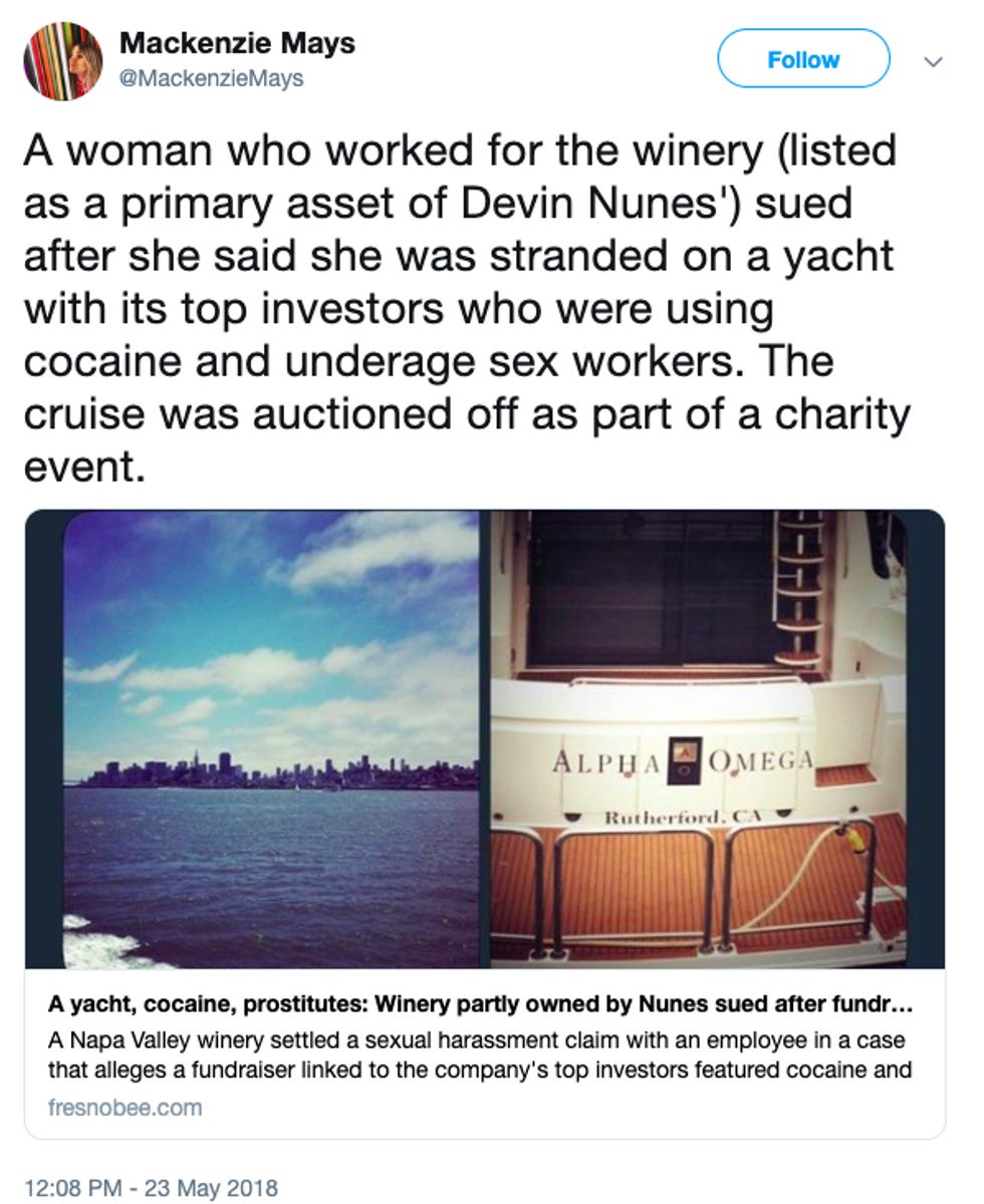 So what happened? Well, McClatchy published a story last May about Alpha Omega Winery, which is partly owned by Congressman Nunes. A former employee of the winery, Alene Anase, sued the company in 2016 alleging that she and other female employees had been ordered to work an event on the company's yacht where partygoers engaged underage prostitutes and used cocaine. None of this is contested, and yet Devin Moocow Bovine Encephalitis Nunes is suing for DEFAMATION BY IMPLICATION because printing true facts about a congressman is against the law now.