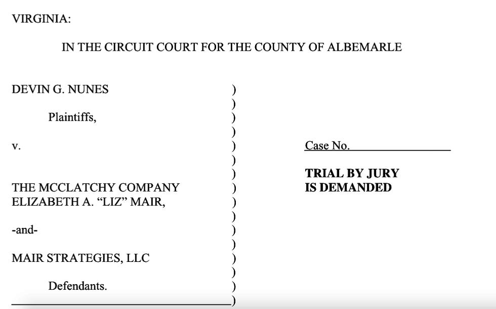 Approximately five minutes before Nunes went on the air, Fox dropped this story with a link to the text of the suit. Except it wasn't a copy of the docketed case from court -- you can tell because it has no case number.