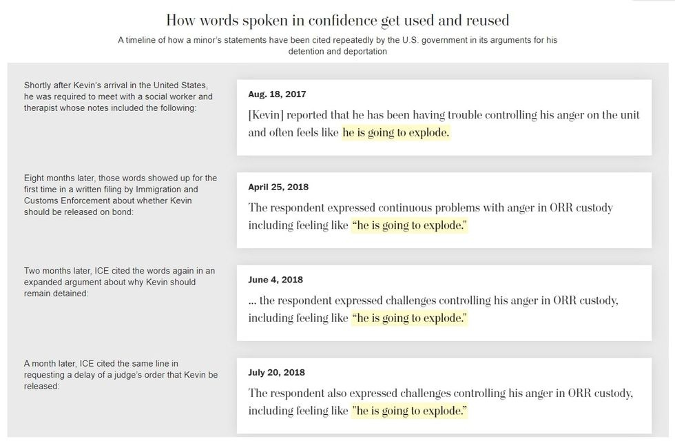 In the Washington Post, Hannah Dreier focuses on the ordeal of one young Honduran asylum-seeker, Kevin Euceda, who lived through hell and escaped an MS-13 group that wanted him to kill someone to prove his loyalty to the gang. In 2017, he crossed the Rio Grande with his older sister; she was 18, so was quickly deported. But Kevin, then 17, was placed in a youth shelter that contracted with the Office of Refugee Resettlement, which is responsible for housing minor immigrants until they're placed with sponsors (or, increasingly, until they're old enough to deport). By law, all detained kids are required to see a counselor within 72 hours of coming into the ORR system, under the 1997 settlement meant to protect detained kids. Haha, joke's on you, Kevin: Under Trump, those sessions were no longer confidential, although the counselor — a recent graduate doing work toward her professional license — didn't know her notes would be turned over to ICE, either.