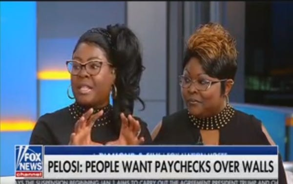 The Damsels of Dumb, Diamond and Silk, sashayed their way onto the set of "Fox & Friends" to kick some knowledge to their MAGA peeps, and call out Nancy Pelosi for not understanding walls. Uninformed and idiotic inanities dropped from their lips as fast as Melania's poll numbers fell when we saw her new yellow hair. They had soooo many dumb questions. Why does Nancy Pelosi get to live her sweet, cushy life residing in a domicile that has actual walls holding back the massive hordes of enemy migrants who would slaughter her like a scene out of The Purge ? Mm hmm, that's right! Also, doesn't she even know that walls keep people from coming in and stealing your stuff? Pelosi has walls, we have walls, the border has no wall, so let's build a border wall, because everything needs walls, you betcha! Plus, we can deploy the entire fucking Army to our side of the border to stop bad things and stuff because ... wait, are they really saying we should turn the border into a demilitarized zone? Yes, yes they are!