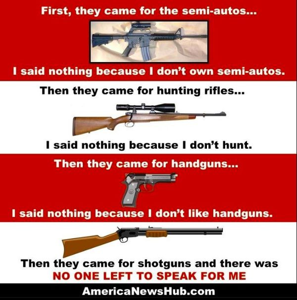 We found an especially charming variant just now, although it dates from solemn commentary published in 2013, a few months after Sandy Hook, when Congress threatened to take away all the guns or at least close the gun show loophole, which is exactly the same as taking all the guns. You just know someone's having deep thoughts when they start with Martin Niemoller, then move to the next most obvious example: