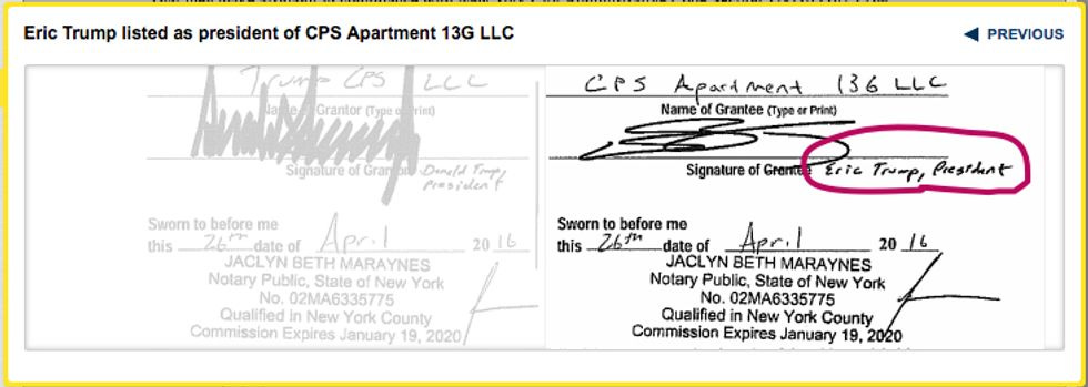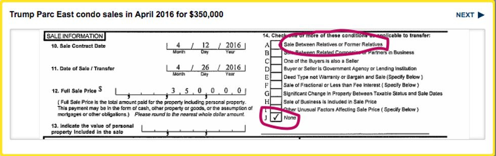 So when the State of New York asked if the parties to the transaction are related, Donald Trump was obliged to say, "Yeah, that albino dipshit is my son." And he didn't.