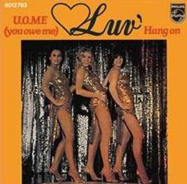 Here is "U.O.Me (Welcome to Waldolala)," a music commercial made circa 1978, in which the Dutch trio Luv' teach all about the "public policy trade-offs" required to pay off interminable debt. They also sit on motorcycles, wear angel uniforms, and sing calmly while creepy old man masks hover nearby: