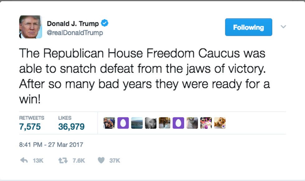 Following that, he started yelling about healthcare again, and how mad he is that the Republican House Freedom Caucus sabotaged all his beautiful plans. Apparently no one saw fit to tell him about the new narrative that Sean Spicer is trying to peddle in which Trump actually walked away from Ryan's healthcare plan because it was a bad deal.