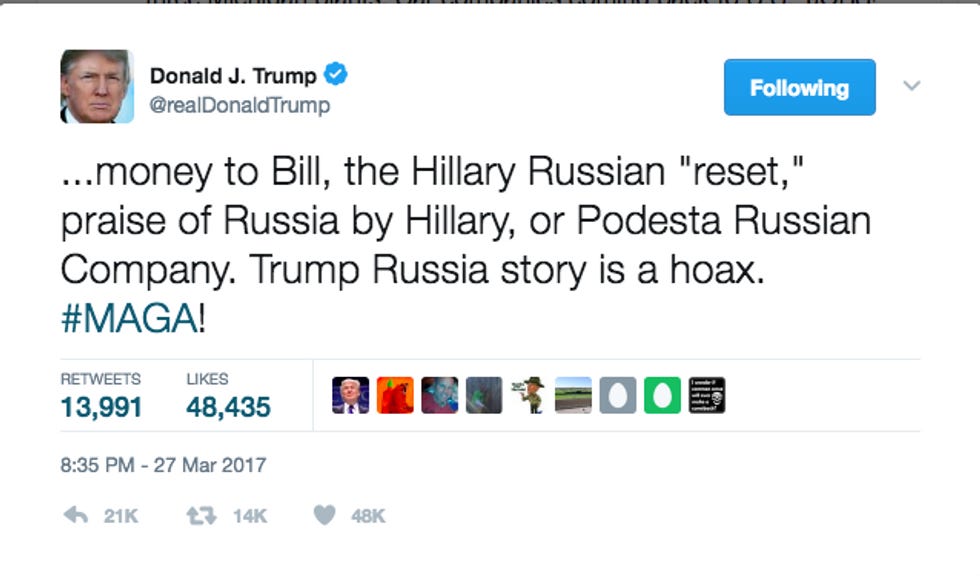 It's really cool he clearly thinks he is still campaigning against Hillary Clinton, but even cooler how he ends it "Trump Russia story a HOAX!" like he is a person other than Donald Trump weighing in on this situation. It's almost like he's throwing his Twitter voice! Or maybe he's writing this in the persona of former Trump spokesman John Barron? Who knows!