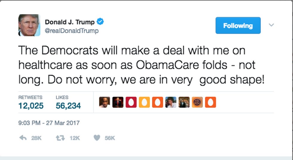 Donald Trump took to Twitter last night, ostensibly after shoving his entire head into a trough of Bennies and milk, to yell a lot about Hillary Clinton, Russia, and healthcare.