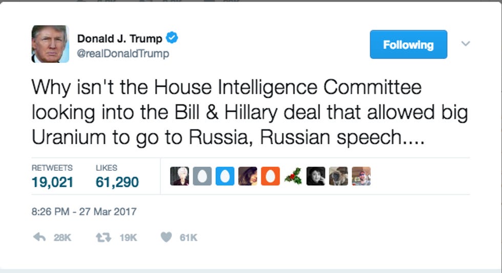 Apparently frustrated by the recent investigations into his son-in-law Jared Kushner, whom he has given at least 45 new jobs in the last week, and his ties to Russia, Trump demanded an investigation into his dumb, and already debunked, conspiracy theory about Hillary Clinton selling uranium ore to the Russians for nefarious purposes.