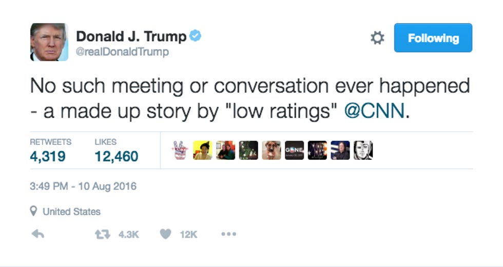 Following Sciutto's tweet, Donald Trump himself responded by announcing that no such conversations had taken place, and bestowed one of his famous super clever nicknames upon CNN.
