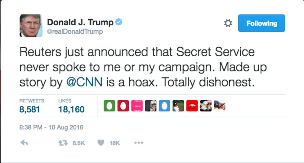 Later, Reuters ran a story stating that Secret Service members had not had a "formal" meeting with the Trump campaign. Trump then tweeted that the Reuters article said that no speaking had taken place, which wasn't actually what the article said at all.