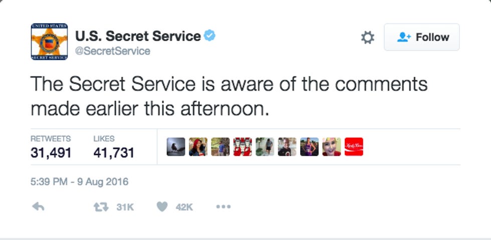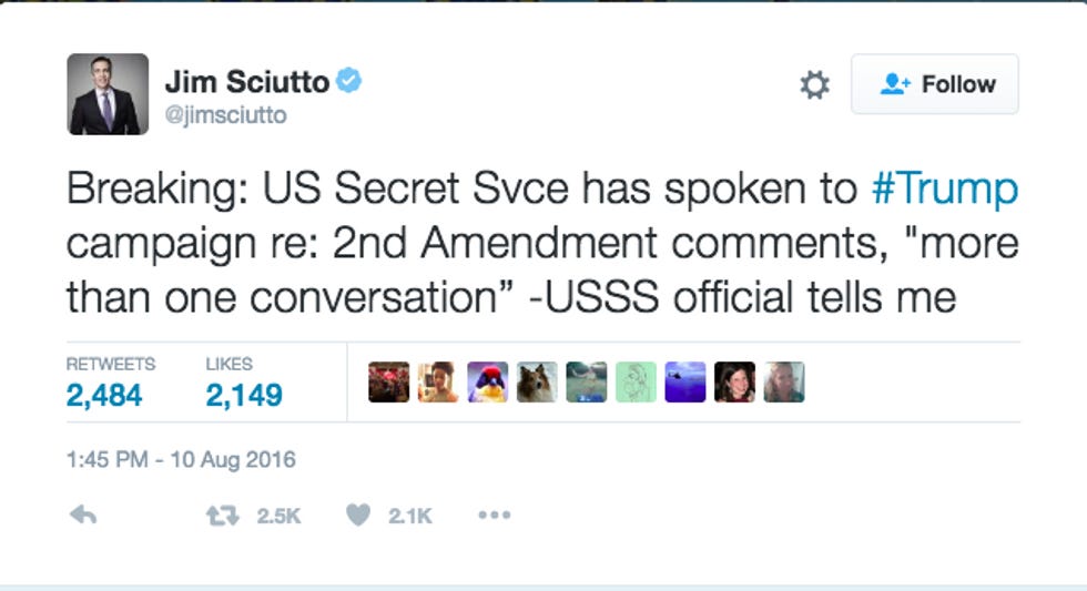 On Wednesday, CNN reporter Jim Sciutto tweeted that he had spoken to a Secret Service official who told him that Secret Service members had "more than one conversation" with the Donald Trump campaign about his little "Second Amendment People" comment.