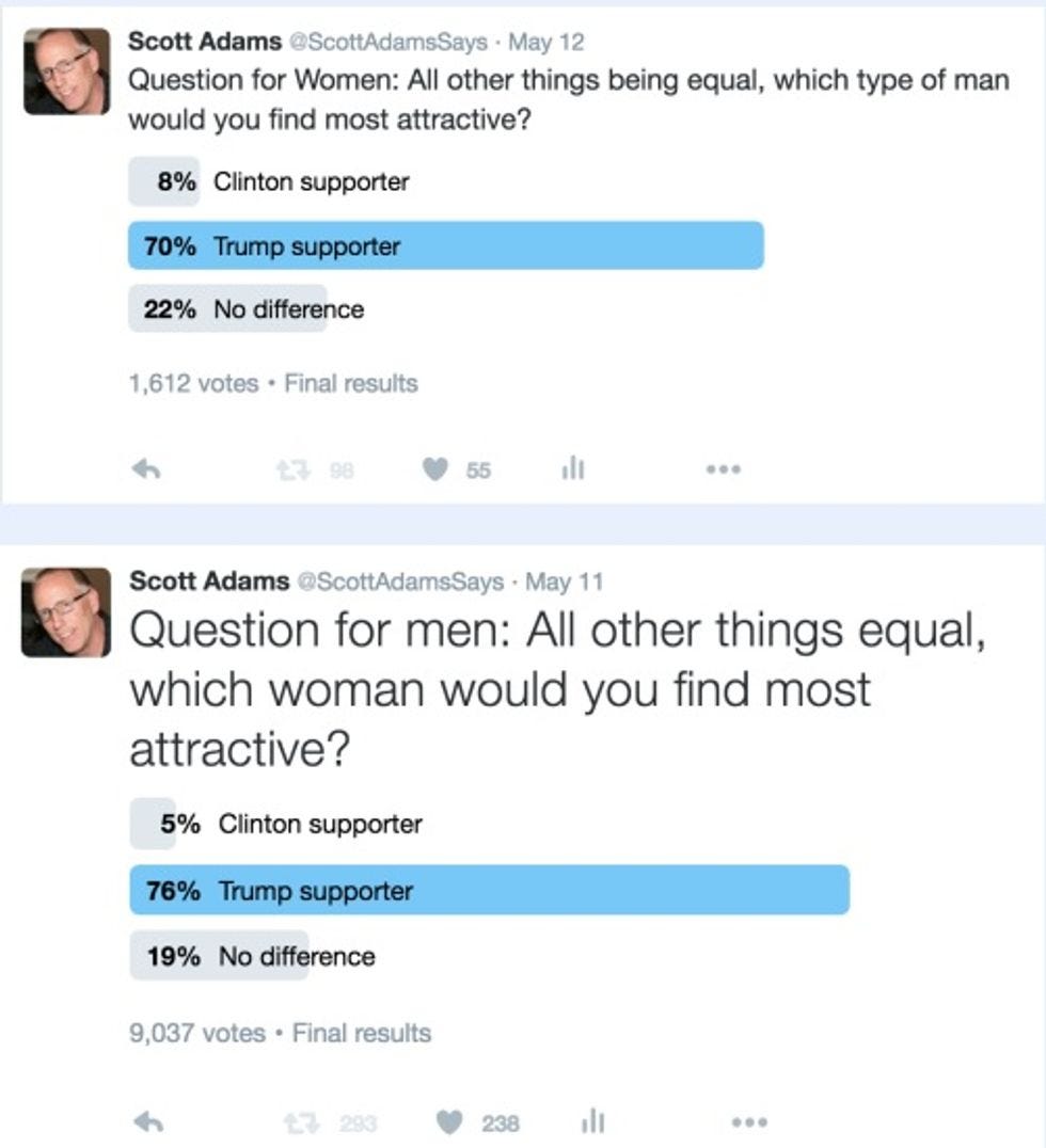 So now, he's aimed his powerful Thinking Parts at the question of attractiveness and power, and has Thoughts about "Power, Persuasion, and Attractiveness." And he would just like his readers to know they think they are very attractive. That's why he did what he readily admits is a completely meaningless Twitter poll, because he knows his readers "are mostly pro-Trump, and male":