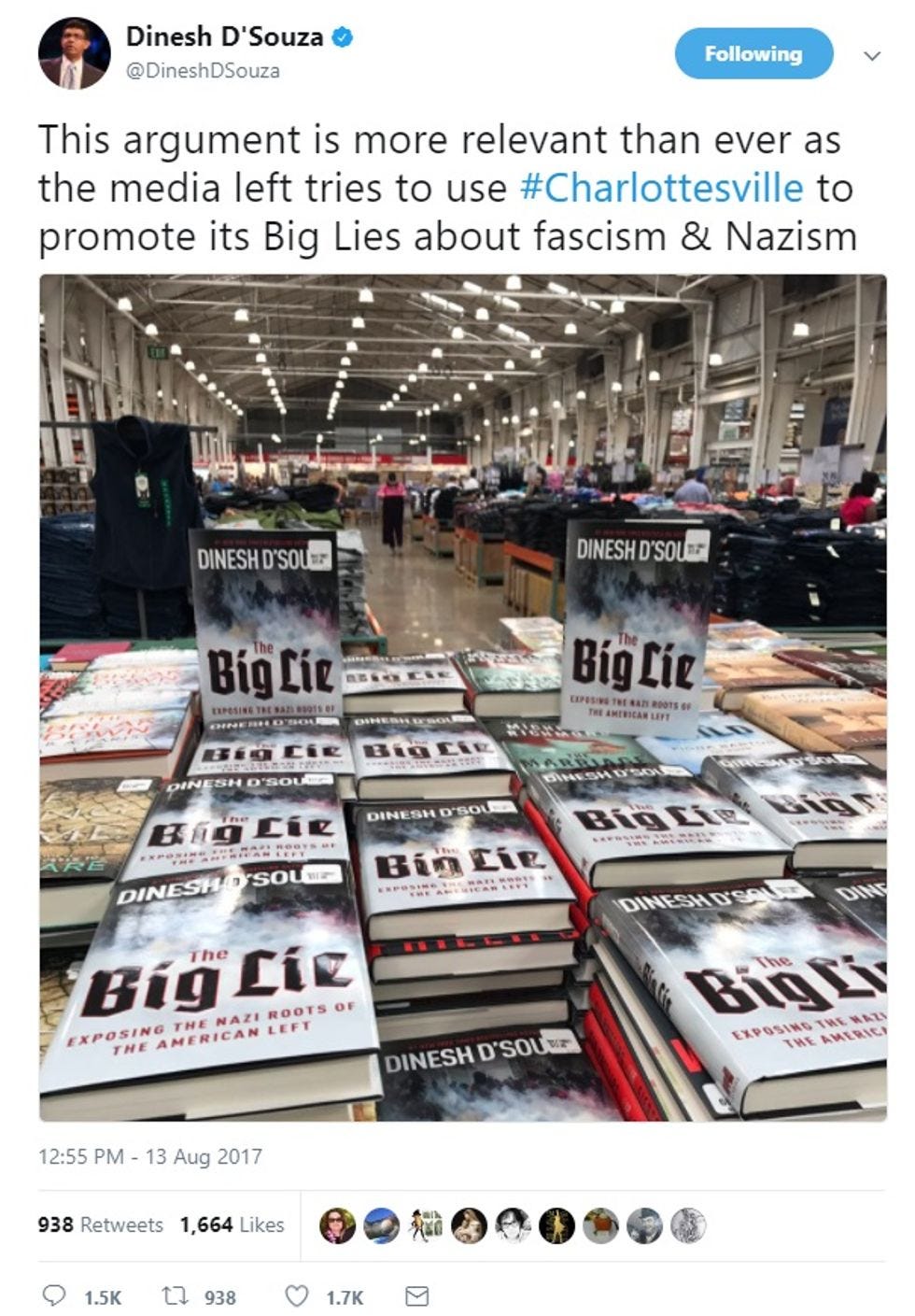 After the Charlottesville Nazi situation, where actual Nazis committed murder, D'Souza, an Indian-American immigrant, sided with the Robert E. Lee statue. Also after the Charlottesville Nazi situation, D'Souza went to a Costco and put his books about the Nazi Liberals on top of other books on the Costco book display to make it look like his book was SO FUCKING POPULAR it required the most gigantic of Costco displays, to feed the marauding hordes of Costco shoppers who wouldn't be satisfied until they got their hands on his very important book. Then he tweeted it: