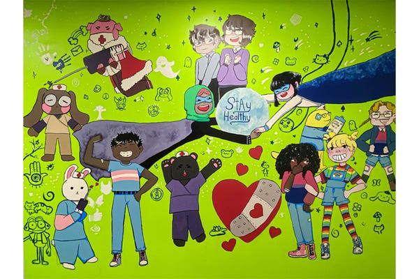 The mural features a bunch of happy goofy multi-ethnic anime-influenced characters, including a couple of masked superheroes in capes (one wears a hijab, which somehow nobody appears to have freaked out about?), animal characters in nurses' outfits, with syringes, and a bunch of small doodles depicting stars, mushrooms, Hello Kitty, Pomupomupurin (the doggie in the beret), and other images.