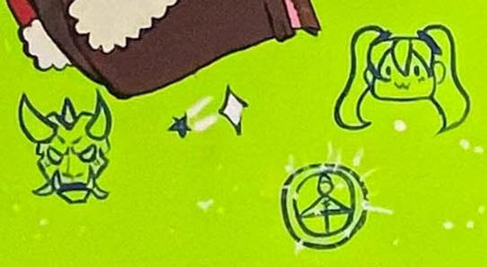 Then there's all the "witchcraft" and "Satanism" in the line-drawing doodles, which include a scary demon from a video game, which has to be Satan Himself no matter what the artist says. We're with the kid — it looks far more like a Japanese Oni ogre mask, what with the extra fangs and horns, than a traditional Western depiction of the Father of Lies. Still a demon. (Gaming blog Kotaku identifies the image as coming from the game "Genshin Impact.") Also, why is nobody losing their shit over the obvious drawing of Hatsune Miku, who is a pop idol despite not actually existing?