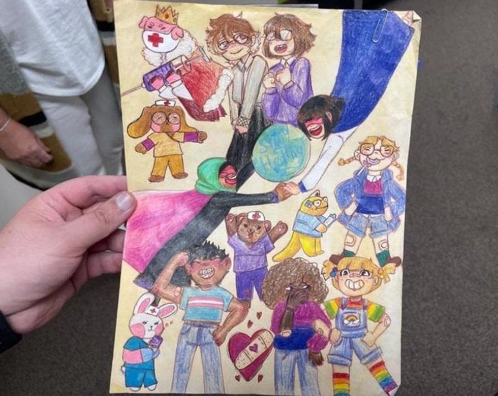 Parents who came to fulminate at an October 10 school board meeting saw nothing but the most malign motives in the cheerful painting, because isn't everything in the public schools terrifying and communist and satanic these days? One parent objected, regarding the trans flag image,