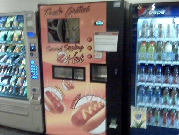 An ecstatic Hill staffer spreads the good news -- nay, the best news for Hill staffers in probably their whole lives! "Here is a picture of the cock-tease hot dog vending machine that has been inoperable for the past 6 months. With the passage of health care reform which means free coverage for everyone except white males over age 50, the machine is now back in working order so that we can get fat and Obama's death panels can't do shit about it. You can get an Oscar Meyer weiner for $2.00, and some dog labeled 'cheddar' for $3.00." Almost makes you want to work there. All hail the Cancer Machine!