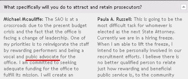 Michael McAuliffe is a 45-year-old candidate for Palm Beach State Attorney with a marvelous plan to "reinvigorate" the staff at the State Attorney's Office by covering their workspaces in a quarter-inch-thick felt made of human pubes, or something. Thanks to Wonkette operative JimmyJohn2 for the tip. [ South Florida Sun-Sentinel ]