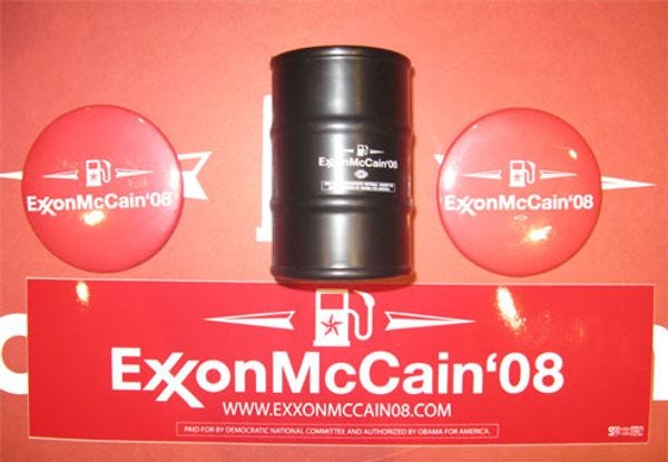 John McCain visited an oil rig today, now that the weather's cleared up. On this oil rig he talked about, well we don't know, maybe how he refuses to endorse Congress' energy bill compromise? And then some DNC mole started handing out this "kit" to reporters on the scene. As you can see, the kit can be arranged into a cock-and-balls sort of arrangement. The black oil barrel in the middle is actually a stress toy. So when you are angry you can squeeze it as you would John McCain's stubby black cock. [ Political Wire , The Trail ]
