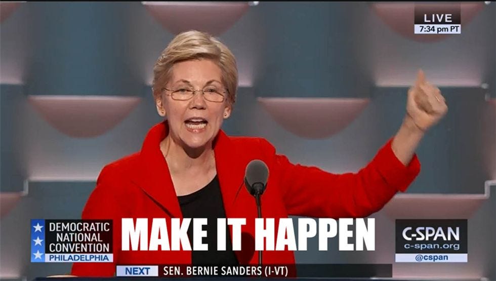 10: 28 Elizabeth Warren is worried that the American Dream isn't working, because the system is, ahem, rigged. And has been since the Reagan years. "Does anyone here have a problem with that?" Oh yes, we do.