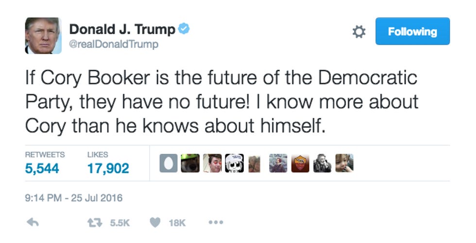 9: 47 Nothing better than a New Jersey senator to remind us what Donald Trump did to Atlantic City. "I'm from the Great Garden State, and we've seen how he leads in Atlantic City. He got rich while his companies filed multiple bankruptcies."