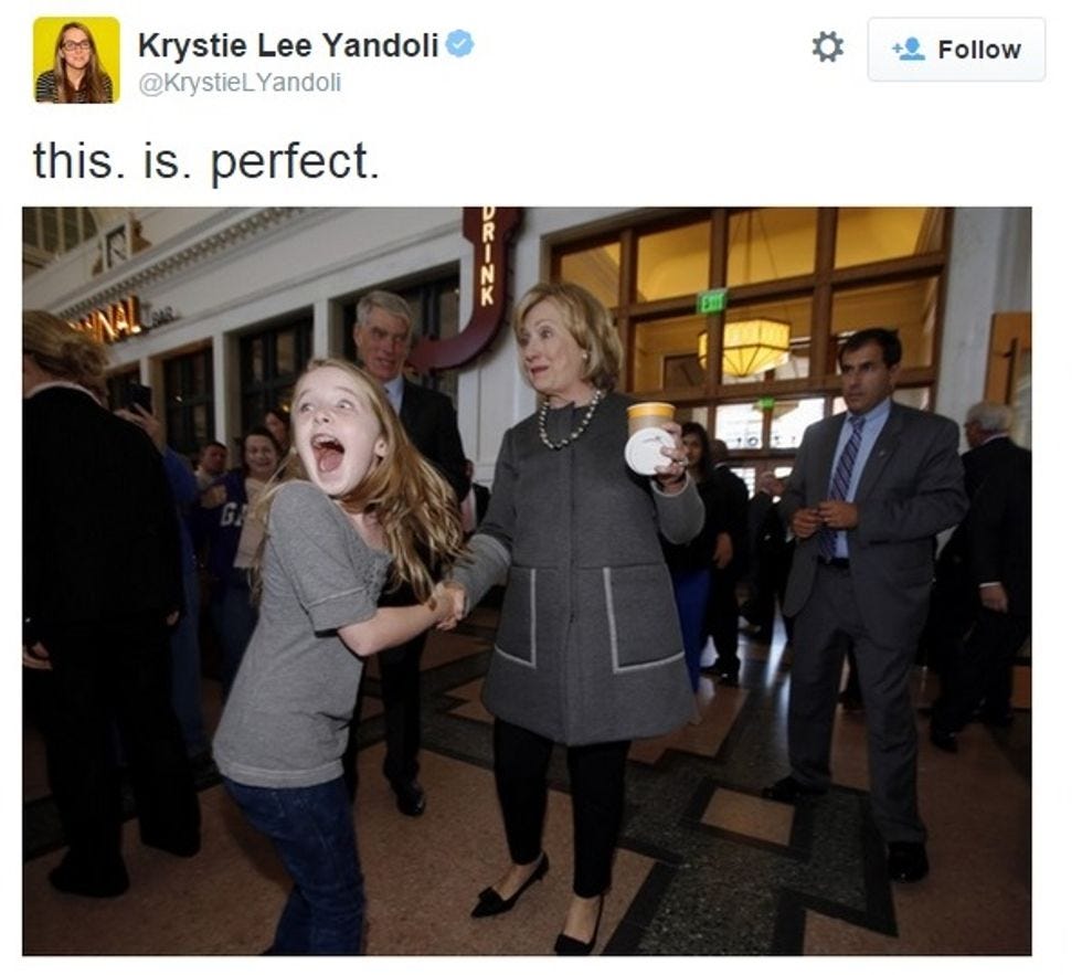 11: 15 Hillary shattered the Glass...uh, flat panel display? Also, that line about "if any little girls are watching" reminded us of this: