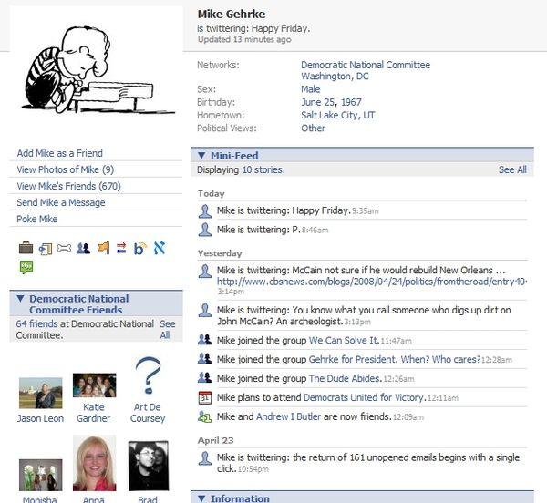 A very small outragewe ignored on Friday had to do with the Democratic National Committee's Director of Research, Mike Gehrke, making dumb "John McCain is old" jokes on this "Twitter" web thing. Whodoesn't make jokes about McCain's advanced age, right? But today, we are amused, because somebody sent us this screencap ofanotherdamning "Twitter" that (allegedly) shows the same Gehrke guy now implying that Charlie Gibson will sing a whimsical song about fucking John McCain. Also, "doring." That is how he spells doing ... or during . Also: Dolphin furry avatar.