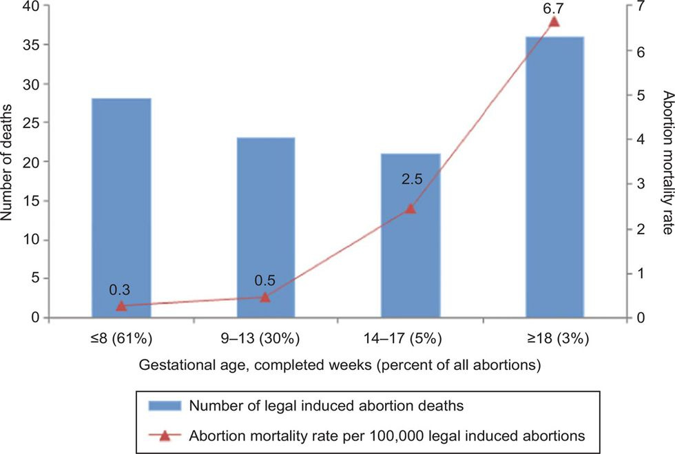 For instance, the law states , "A woman is ninety-one (91) times more likely to die from an abortion performed at twenty-one (21) weeks' gestation or later than she would have been had the abortion been performed in the first trimester."