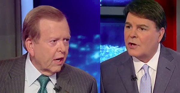 Sure we're barreling toward a catastrophic Constitutional crisis -- but these two bastards are going to sell a lot of books! Knowing that Donald Trump parks his ass on the sofa for 12 hours a day to mainline Fox News and livetweet his nervous breakdown, Lou Dobbs and Gregg Jarrett brought the good shit last night! Poppy needs his fix, so Lou and Gregg are turning that studio into a shooting gallery. Wooohooo, time to burn the whole Justice Department DOWN!