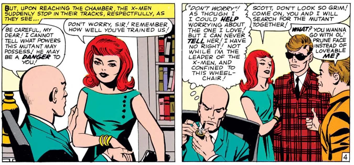 I did see a lot of “what about Professor X?” as if that one heroic example contradicted all the other negative depictions, and Charles Xavier also plays into a related trope. In an early issue from the 1960s, Professor X’s thoughts reveal that he’s in love with the teenage Jean Grey but believes he “had no right” to share his feelings with her because he “was leader of the X-Men and confined to this wheelchair.” The first part makes sense for HR-related reasons, as well as most states’ age of consent laws, but people with disabilities can (and do!) live normal, fulfilling lives. There are more options available than isolation or mad science.
