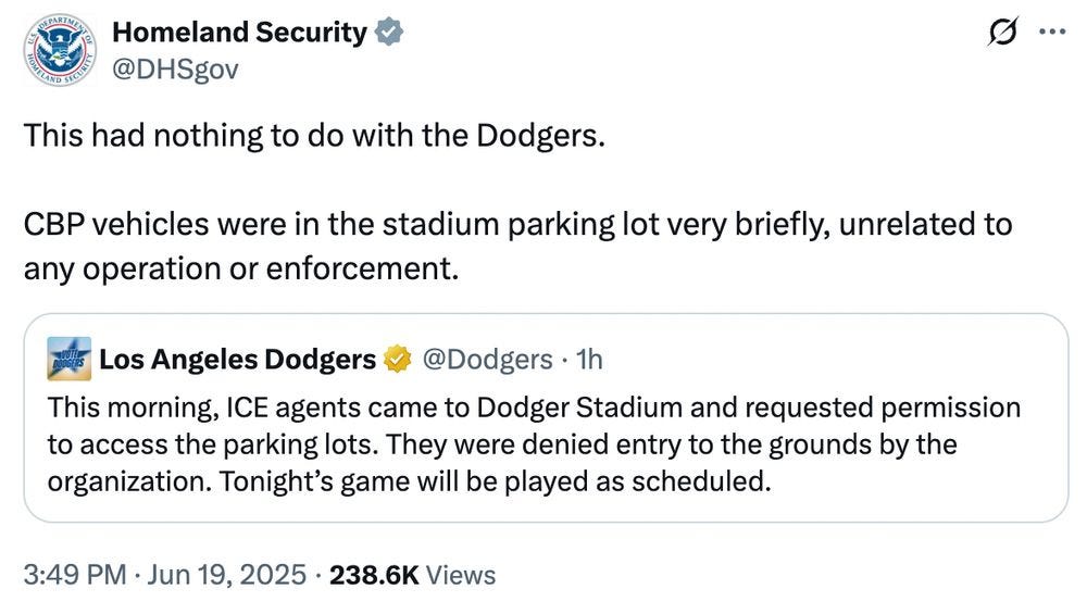 Specifically, DHS decided to fuck with the Los Angeles Dodgers, a civic institution in the city that the Trump administration keeps lying about the state of in order to justify a harsh law-and-order crackdown on undocumented immigrants and some documented immigrants and some US citizens just for a treat.