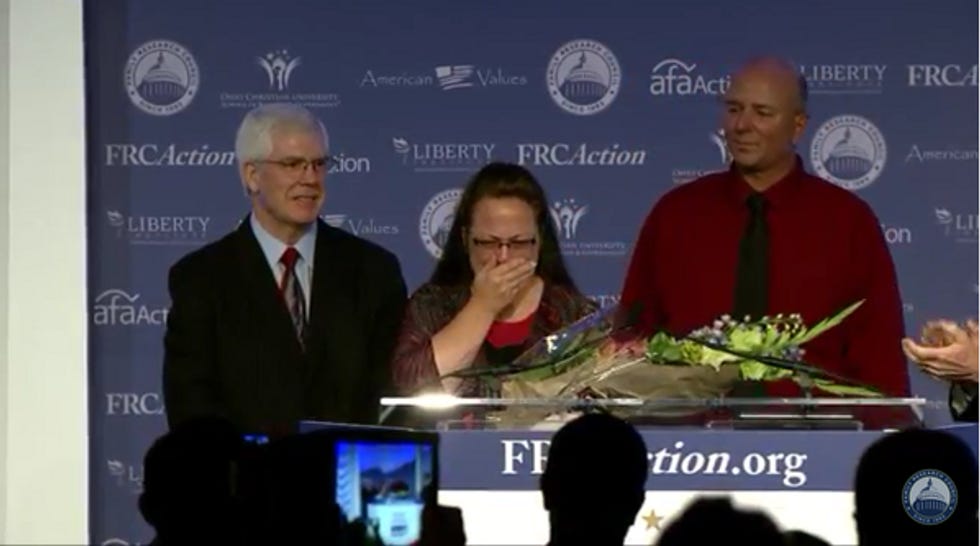 As you all SHOULD know, Kim Davis got the Award For Being The Best American Martyr Of America Award from the Family Research Council -- Josh Duggar's former employer -- at the East Coast outpost of the Folsom Street Fair known as the Values Voter Summit. And her husband came along, of course, because come on, Kim Davis alone in a hotel with a bunch of rabid right-wing men? Be still, their throbbing dicks. Of course she needed supervision. Anyway, Bubba or whatever his name is (it is Joe) knew it was a "Here's your one chance, Fancy, don't let me down" moment, and a MUCH bigger deal than just meeting Mike Huckabee, so he borrowed a shirt and tie from somebody, maybe one of Kim's gay friends: