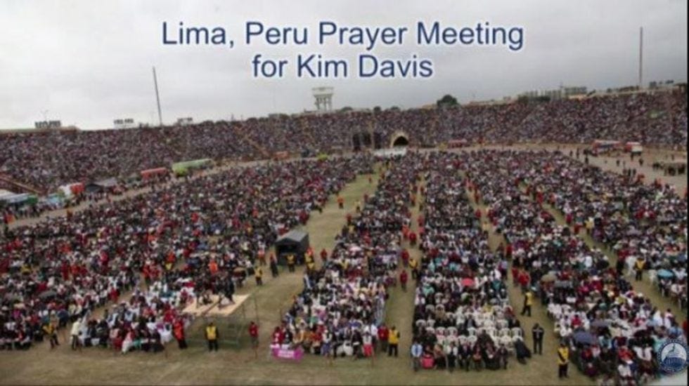 The image seems to have first been tweeted the day before the summit by Matt Barber, also of the Liberty Counsel, who claimed, “Christians in Peru had a prayer rally for #KimDavis & American Christians. over 100K showed up. Amazing!” Staver posted the image a second time on Sunday, claiming that Peruvian Congressman Julio Rosas was responsible for organizing it.