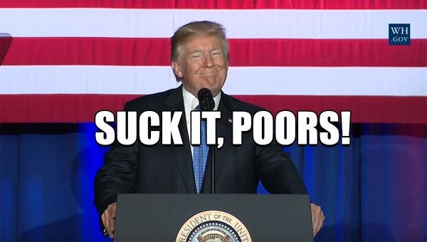 He's so very proud of this, really, that it almost seems like he has no idea what he even did this week, and that it was not very good. First, he scrapped the whole "healthcare subsidies for the poors" thing, which -- in addition to being very bad for poor people -- will also cause everyone else's insurance premiums to rise. Like, literally the insurance companies have come out and said that they will have to raise everyone's insurance because of this.