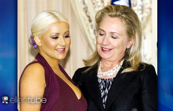 UH OH, TIME FOR JOURNALISM EXPLORATION TIME. Christina Aguilera, the singer with the big shiny voice and also some boobs, was on the Ellen DeGeneres teevee funtimes hour on Monday, and she shared the picture above, of a certain lady who is running for president of America, gazing upon the sumptuous knock-knocks of Xtina!