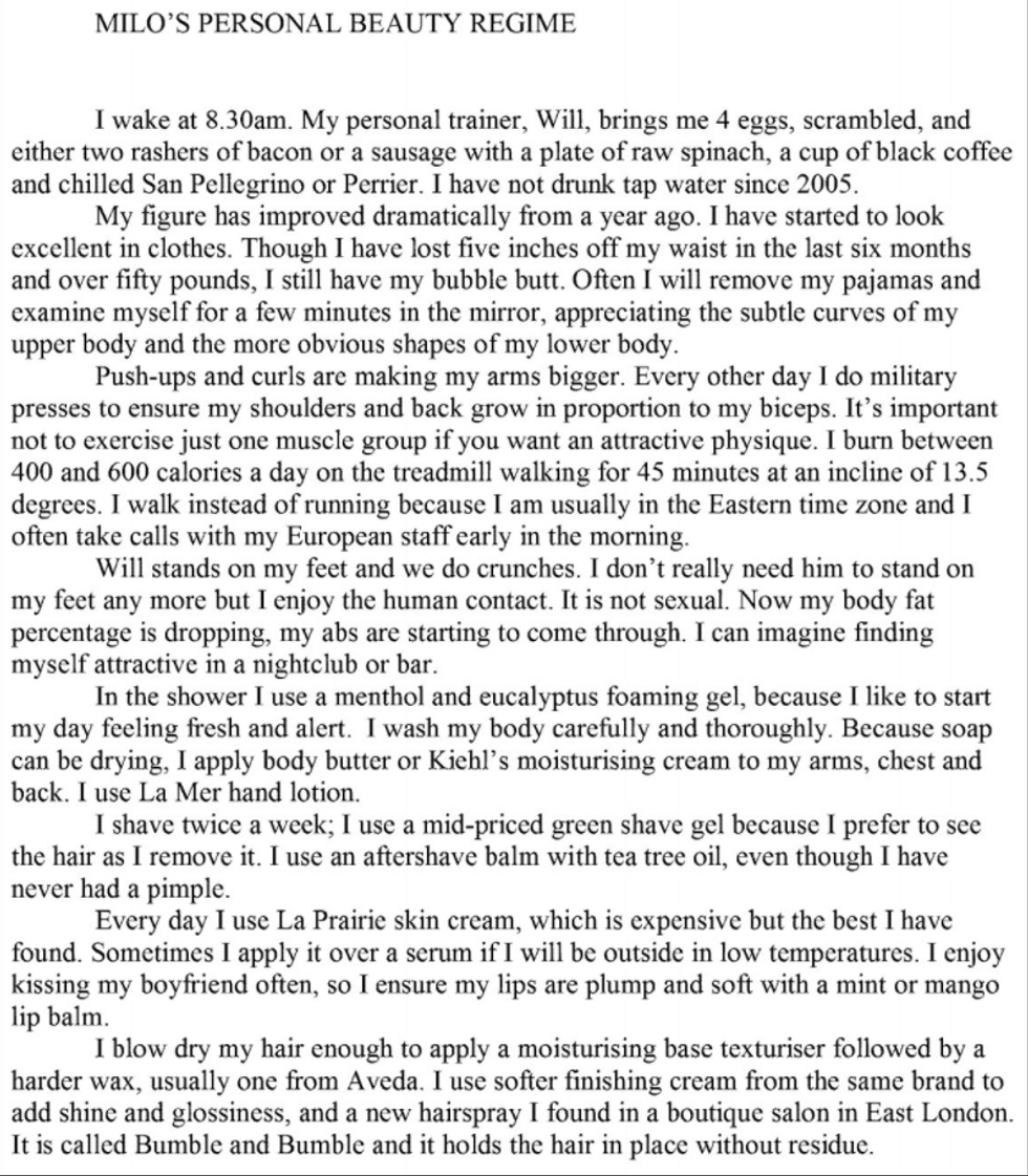 Here, we will leave you with a passage from this truly remarkable book, in case you have ever wanted to look exactly like Milo. Did we say Milo? We meant Patrick Bateman of American Psycho.