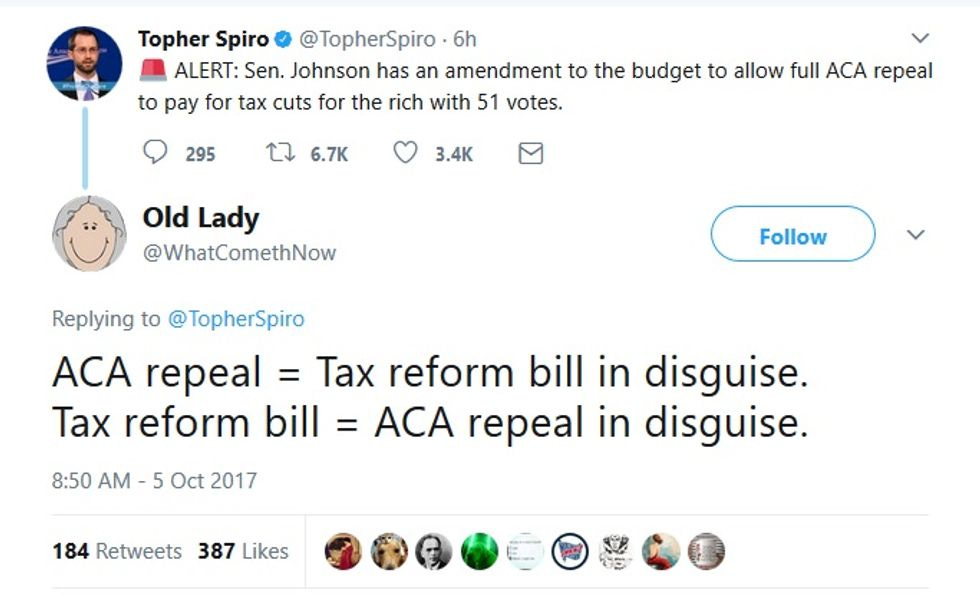 Cute, huh? Experts say the Rs probably won't do that, because the this bill is all about tax cuts. But they're leaving their options open. Since the instructions to the Senate specify the final bill must be written by Finance, it can't include everything that was in Graham-Cassidy, since that would have to be done by the Health committee. But Finance could to plenty of damage. Vox's Dylan Scott 'splainers further: