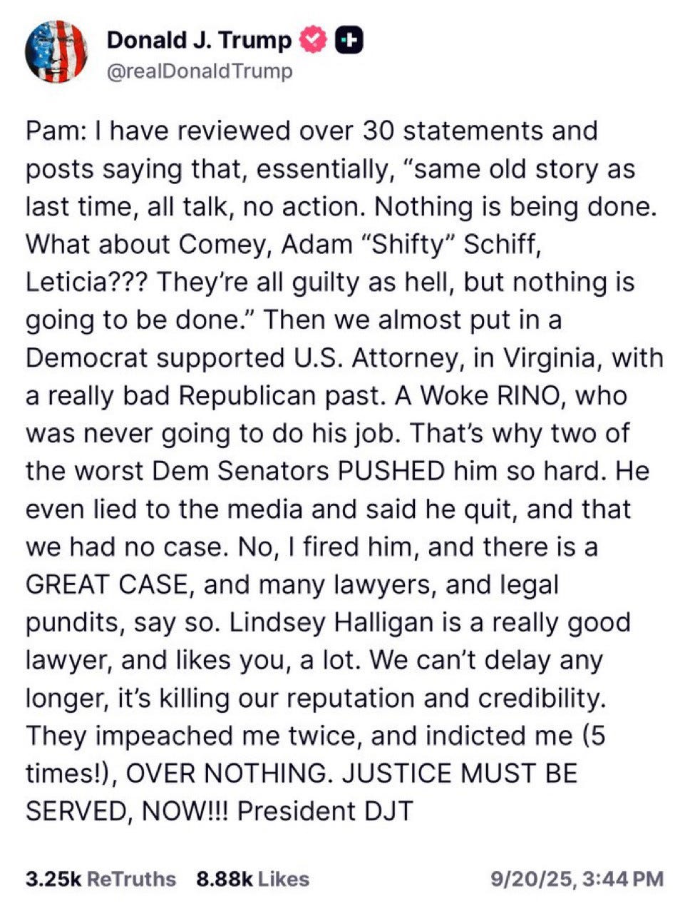 Whoops, President Donald J. Trump pounded out on his glitchy web site that he did what would be a crime for anybody else, and fired the acting US attorney for Eastern Virginia Erik Siebert (appointed by himself) because Siebert couldn’t or wouldn’t find some grand jury to indict his personal enemy Letitia James on account of no evidence. And then Trump quickly deleted his post, which was maybe supposed to be a DM? (NYT gift link)
