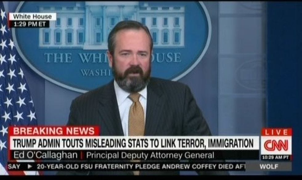 But wait, you are saying, what are all those terrorist "not US citizens" doing here in the first place? You are very perceptive! In fact, somewhere between 80 and 100 of them committed their offenses in Not America and were brought here by the government to stand trial in American courts. That changes the math, if you are keeping count, since people we bring in to prosecute aren't actually immigrants. The White House, however is not keeping count. Which is why they sent Deputy AG Ed O'Callaghan up to Sarah Huckabee Sanders's podium to flog their doctored numbers yesterday. Nice of CNN to factcheck him in real time!