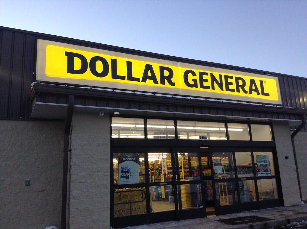 Driving through the Panhandle of Oklahoma / southeast Colorado demonstrated that the only new buildings in small towns are Dollar General stores. This is not an exaggeration. You see the same thing, over and over. Devasted retail in the center of town and on the outskirts, that ugly sign on a new build.