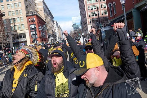 I noticed the Proud Boy by a small patch on his pack. He was chattering into a Baofeng (a cheap Chinese two-way radio) while pushing through an intersection clogged with vendors and corralled Trump supporters waiting to get into the arena.