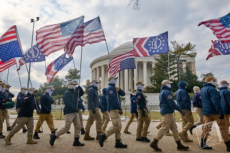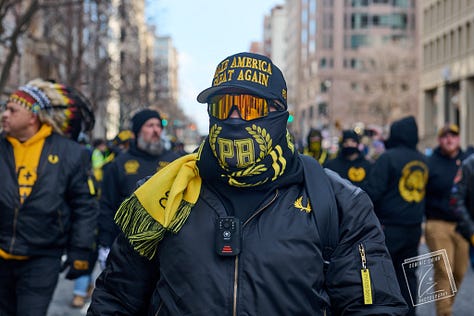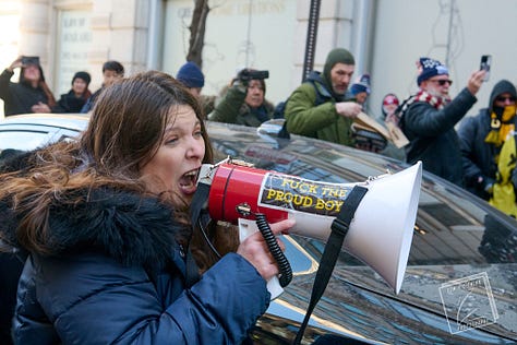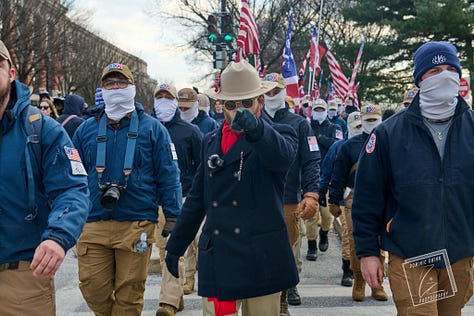There were a few dozen Proud Boys milling around E and 7thNW. Every so often they’d break a silence with a series of spastic grunts and shouts.