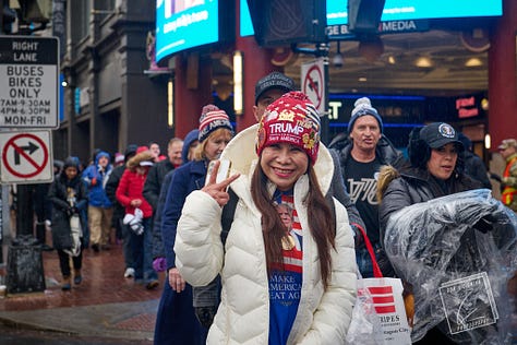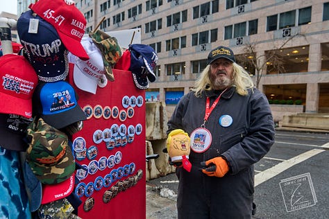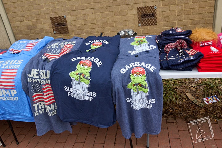 On January 19, Trump was set to hold a rally at the Capitol One Arena in Chinatown. People began lining up at 4 a.m. in below-freezing temperatures. When the sky began dumping freezing rain and sleet, some shelled out for overpriced ponchos being hawked by an endless parade of vendors selling cheap Chinese Trump hats, Trump shirts, and assorted Trump trinkets.