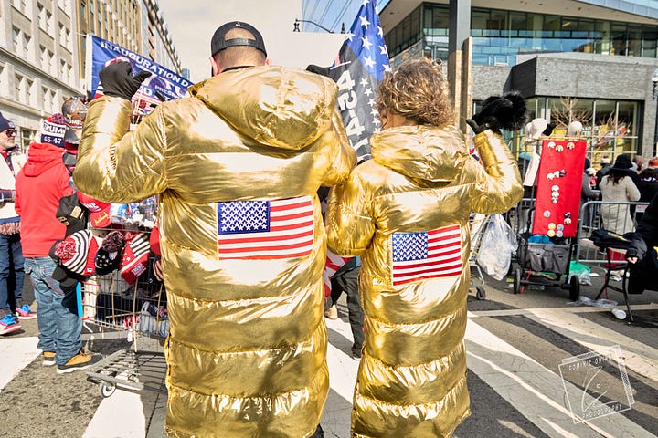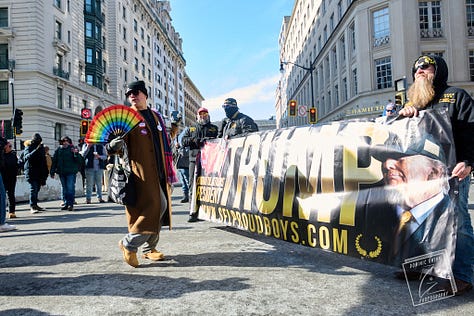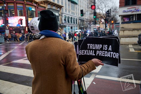 On Thursday, January 18, thousands turned up to protest Trump's inauguration. It wasn't the same crowd as 2016; this was far, far smaller. People were angry, they were clutching rainbow and trans flags, wearing pink pussy hats, and displaying signs that reminded those still paying attention that Trump was convicted of rape, the planet is on fire and that January 6, 2021, wasn’t “a day of love.”